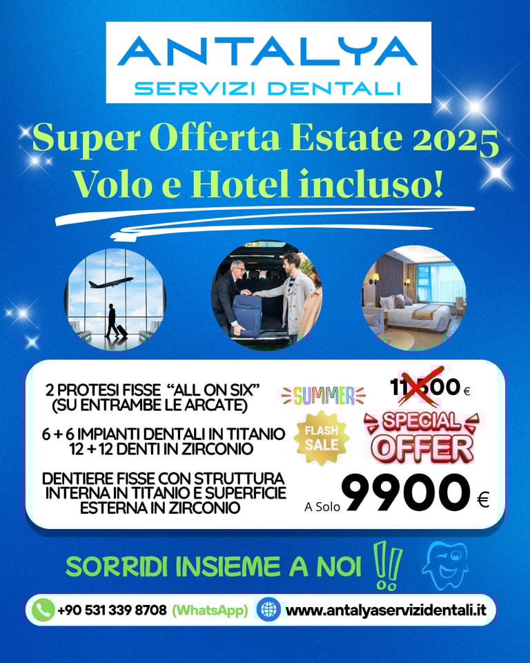 senza alcun compromesso.Volo Aereo Incluso: Includiamo il tuo volo dall’Italia per Antalya, una delle destinazioni più gettonate e sicure per trattamenti odontoiatrici di alta qualità.